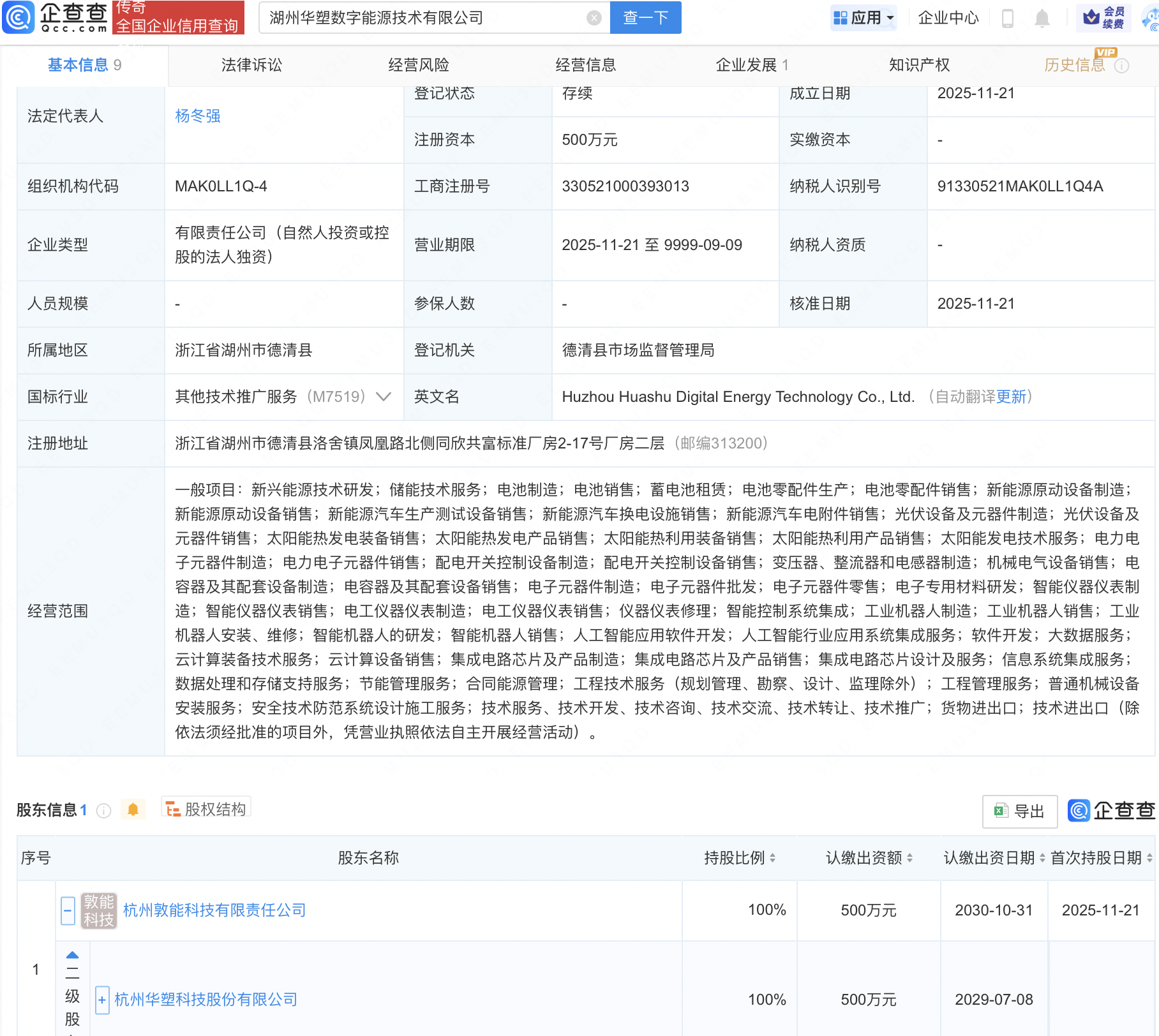 近日,湖州华塑数字能源技术有限公司成立,经营范围包含:智能机器人的研发;智能机器人销售;人工智能应用软件开发;人工智能行业应用系统集成服务;集成电路芯片及产品制造等。企查查股权穿透显示,该公司由华塑科技(301157)间接全资持股。