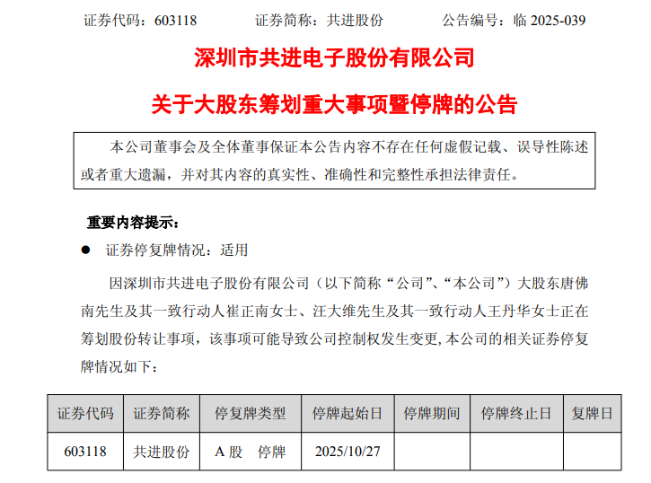 共进股份(603118)10月24日下午披露,公司近日收到大股东唐佛南先生及其一致行动人崔正南女士、汪大维先生及其一致行动人王丹华女士通知,其正在筹划有关本公司的股权转让事宜,该事项可能导致公司的控制权变更。